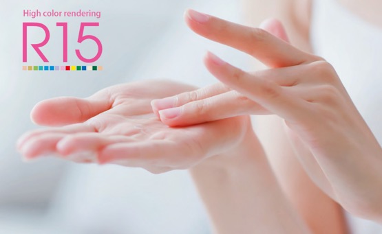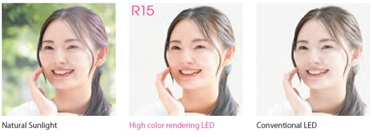 The rapid development of LED technology has entered the stage of improving quality to create a comfortable environment. R15 is one score of the color rendering index. It does not only illuminate Asian skin color to appear accurately but also, various objects in daily life to appear colorful and vivid.