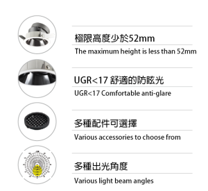 | 配件 Accessories | : | 蜂窩網 Honeycomb louver / 條紋玻璃片 Spread lens / 防眩光杯 Anti-glare cup / 清玻璃片 Clear Lens |